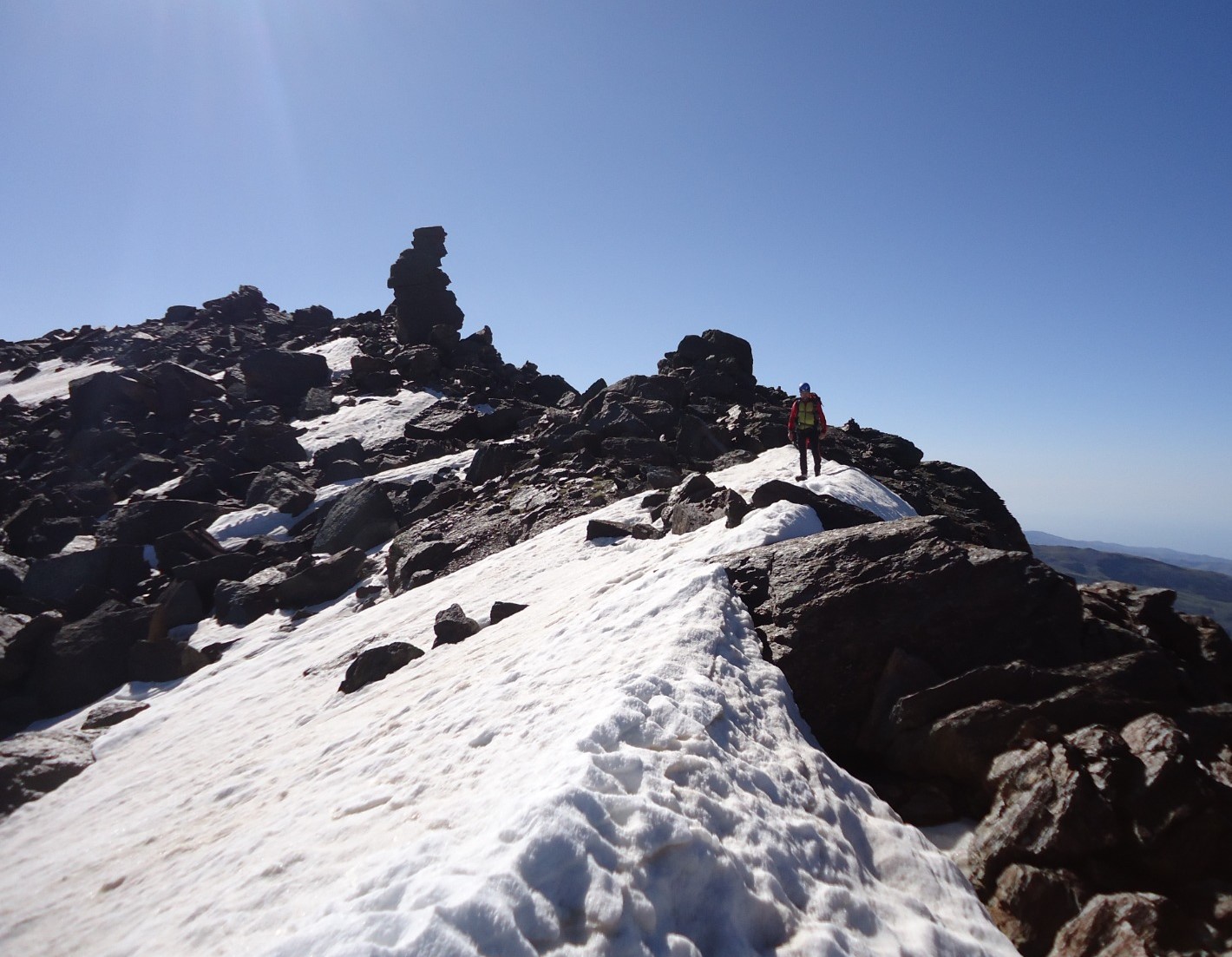 DESDE LA HOYA DE LA MORA PASANDO POR EL VELETA: Dejando detrás la Hoya de la Mora nos encaminamos hacia el monumento de la Virgen de las Nieves, al que no llegaremos y que dejaremos en alto a nuestra izquierda. A partir de esto momento iremos paralelos a la Pista El Águila (la pista más oriental de la estación de esquí) hasta Las Posiciones, allá por los 2900 m, coincidiendo con la cabecera del Valle de San Juan. Desde aquí hay varias formas de acceder a la cumbre: 1. Seguimos entre la arista cimera y la estación de esquí hasta la cumbre, buscando siempre el mejor paso. Esta opción es más “alpina” y por consiguiente en la que más fácil podremos encontrar hielo y otros contratiempos. 2. Continuamos por el camino que hace la Pista del Águila hasta toparnos con el remonte, giramos a la izquierda y seguimos paralelos a él hasta el final. Aquí giramos a la derecha hasta dar con la estación superior de la Laguna. Desde aquí se atisba la cumbre a nuestra izquierda, a por ella.